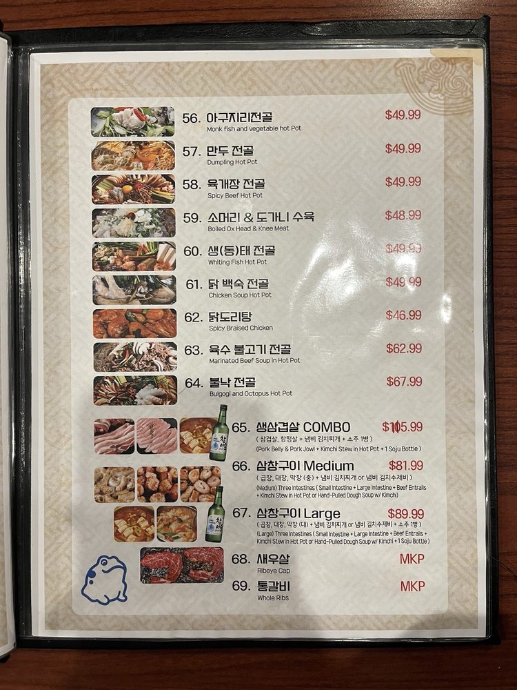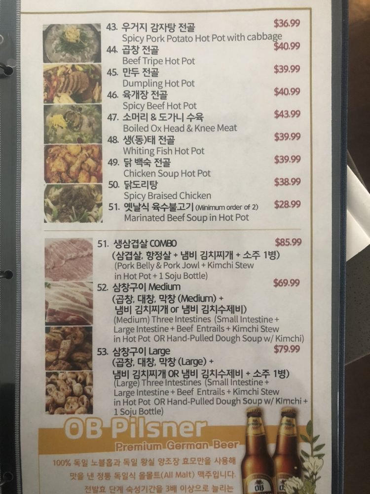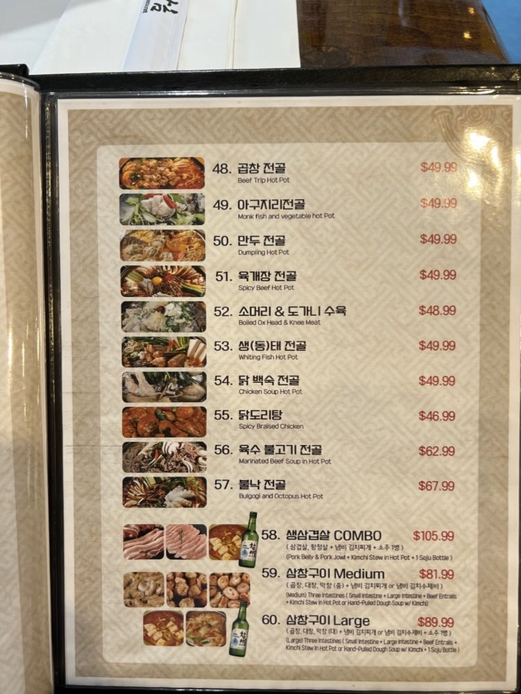 Medium size. Small intestines, large intestines, beef enteails and kimchi stew.